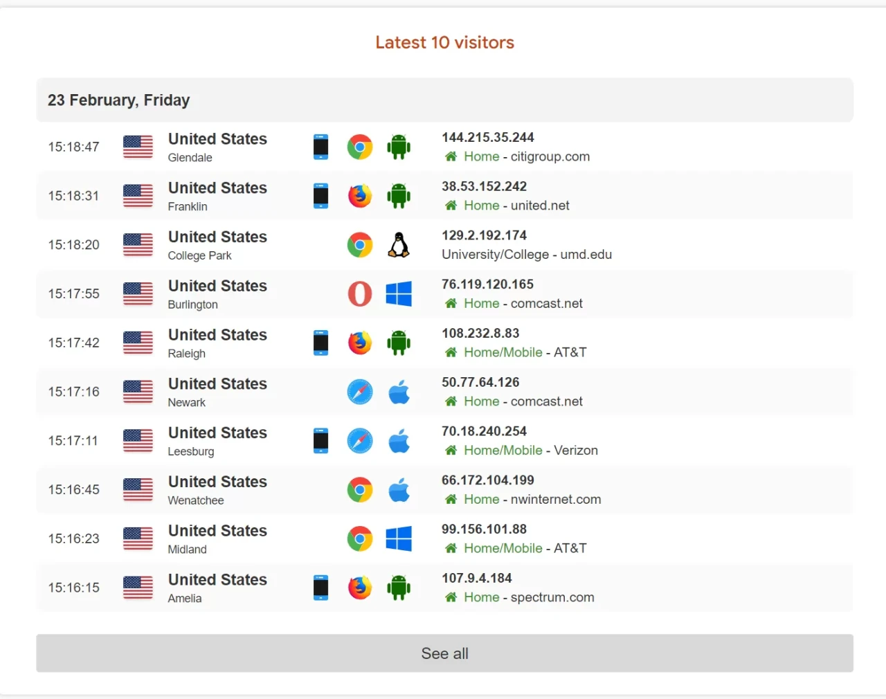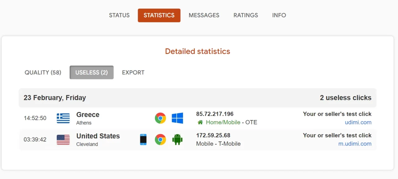 Click See all at the bottom to view detailed statistics for all your clicks: both quality and filtered by Udimi filter.