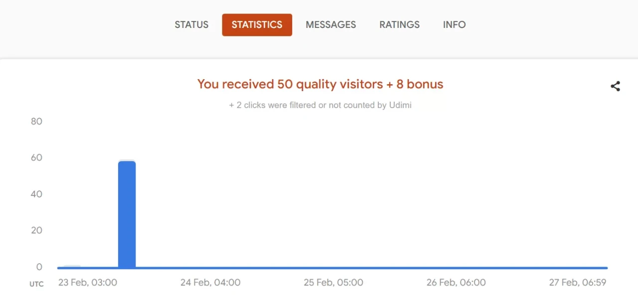 Here, you can monitor all delivered traffic updated in real-time. Your seller has 100 hours to deliver all visitors, and the graph provides a breakdown of this delivery. Please note that all times are shown in the UTC time zone.