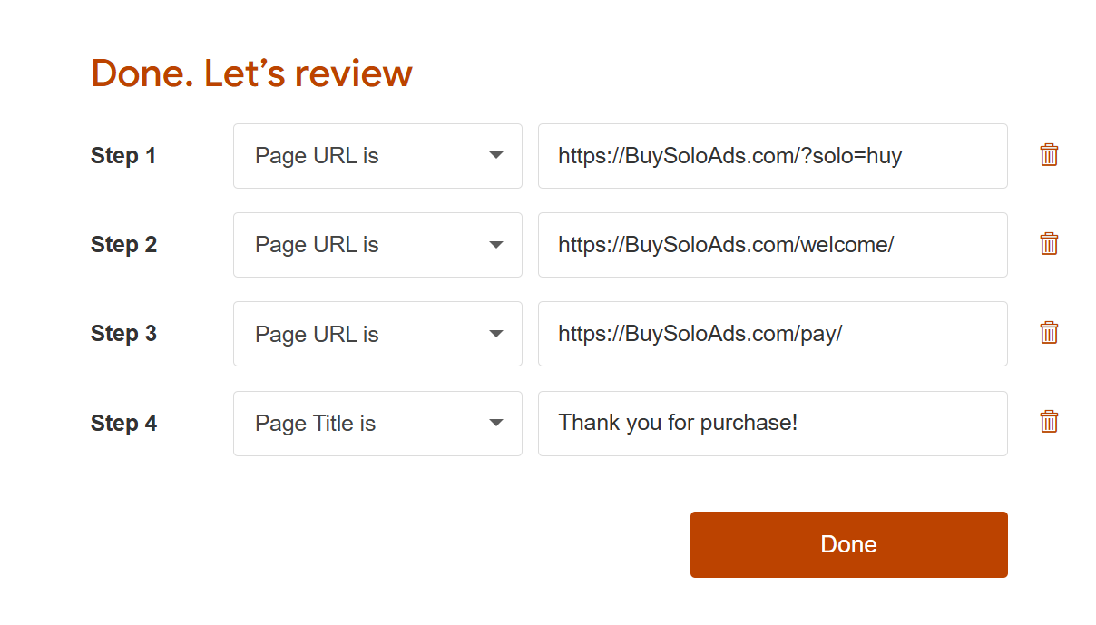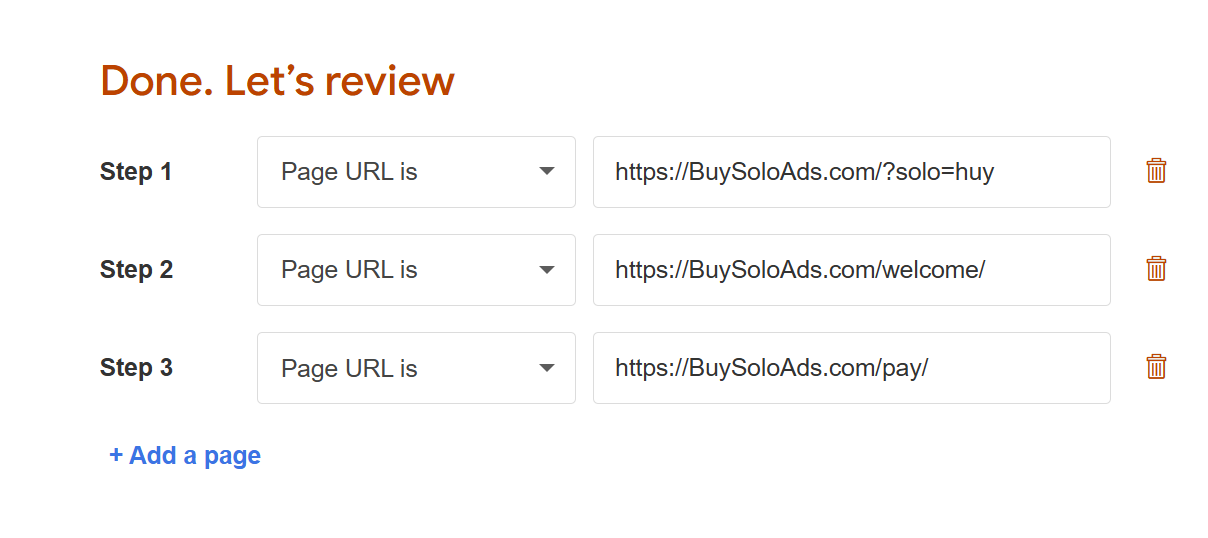 I'll describe how to setup a funnel on an example, where I wish to track how many visitors from a solo ad registered on my site, how many from them visited payment page (but decided not to buy) and finally how many made a purchase.