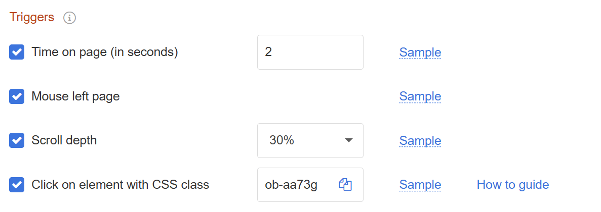Select triggers to show your lead box. Triggers are conditions that must be met in order to display the lead box.