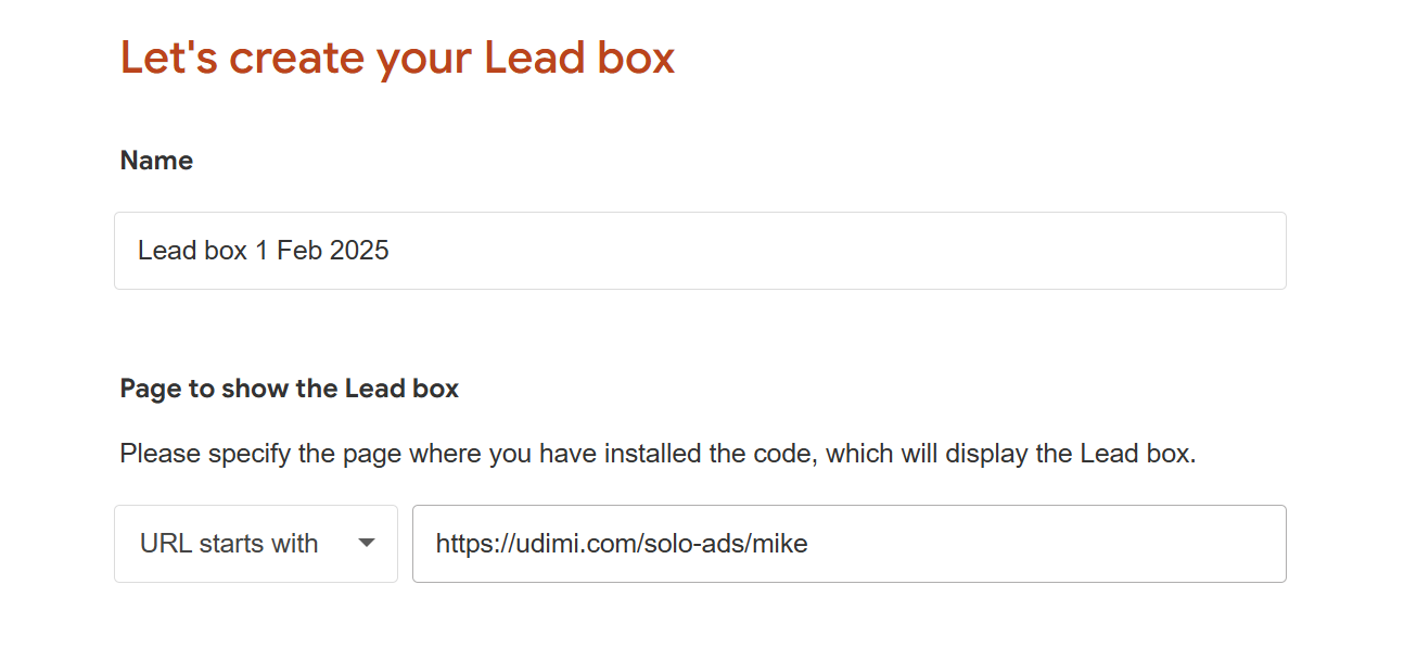 For example, "udimi.com," the lead box will also be shown on udimi.com/solo-ads/, udimi.com/forum/, and so on, because the URL starts with "udimi.com"