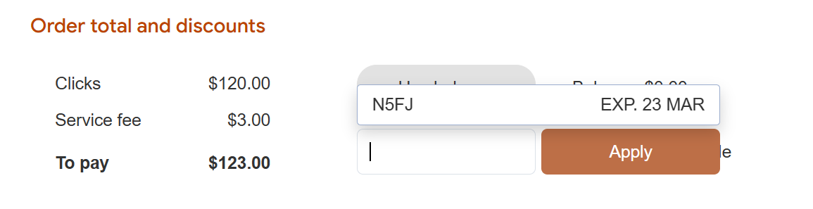 To use your discount code or Udimi balance, just click a corresponding button on the order total page.
