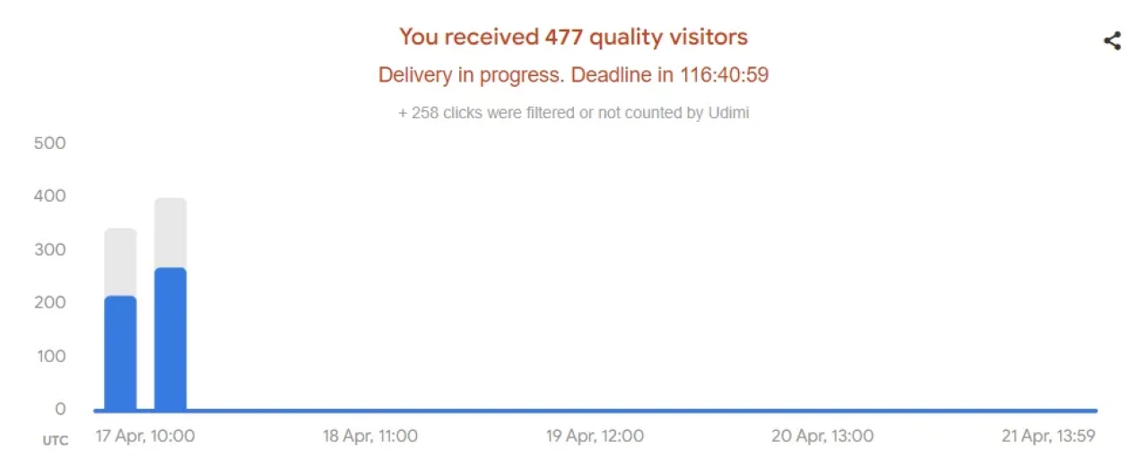 When your seller starts the delivery, Udimi will automatically filter useless traffic and count only quality visitors to your site. How Udimi filter works.