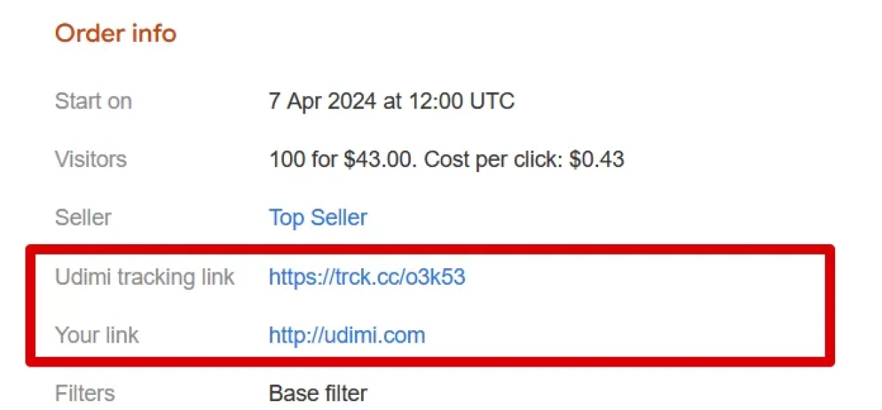 Udimi tracking link is an automatically generated URL that will be used to track the delivery of your traffic and filter it. You don't have to use any link tracking software as Udimi does everything for you automatically.