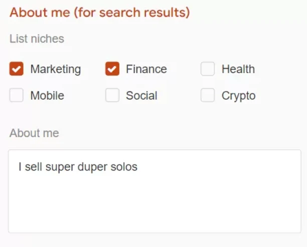 In the 'About Me' section, select your traffic niches and write a description about yourself to enhance your visibility in search results.
